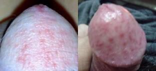 3、性病引起:前期可表现为龟头、阴茎出现红斑、红点,后来表现为红斑上有很多细小的水疱。